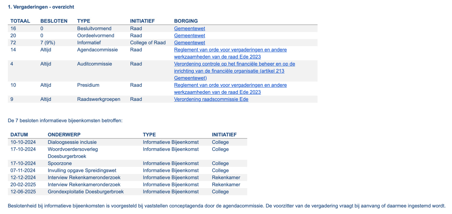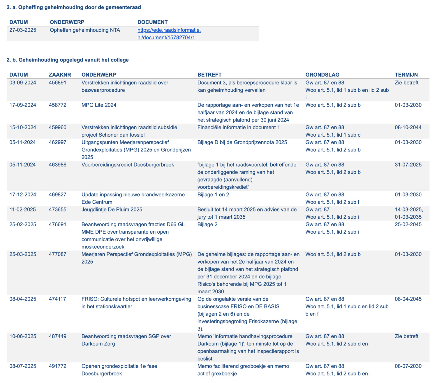 Na de vaststelling van het nieuwe geheimhoudingsprotocol in 2023 vroeg de Edese Vos de griffie om een overzicht van de praktijk. Hoe vaak wordt er in Ede daadwerkelijk besloten vergaderd en geheimhouding toegepast? Het overzicht bestrijkt de periode van 1 september 2024 tot 1 september 2025.