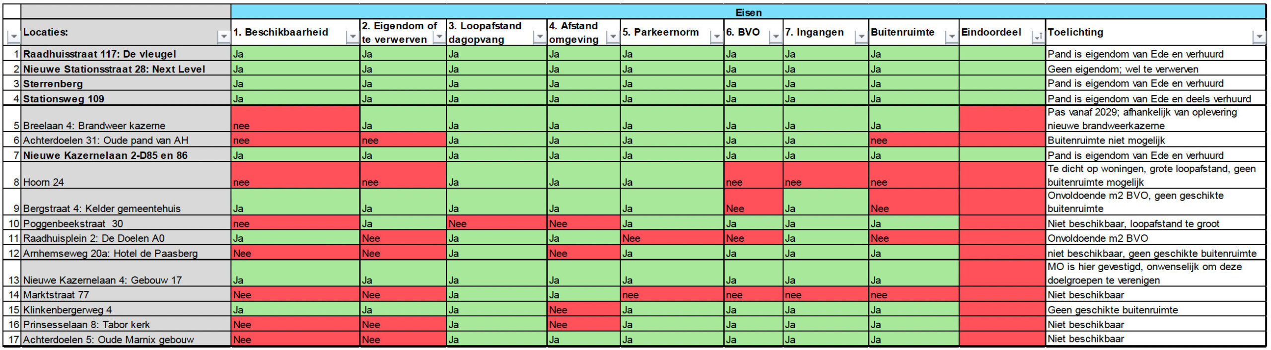 Van de overgebleven locaties werden uiteindelijk vier als technisch en functioneel geschikt beoordeeld. Het Leger des Heils sprak in zijn advies een voorkeur uit voor twee locaties: gebouw 85/86 op het WFC-terrein en het pand van Next Level aan de Nieuwe Stationsstraat.