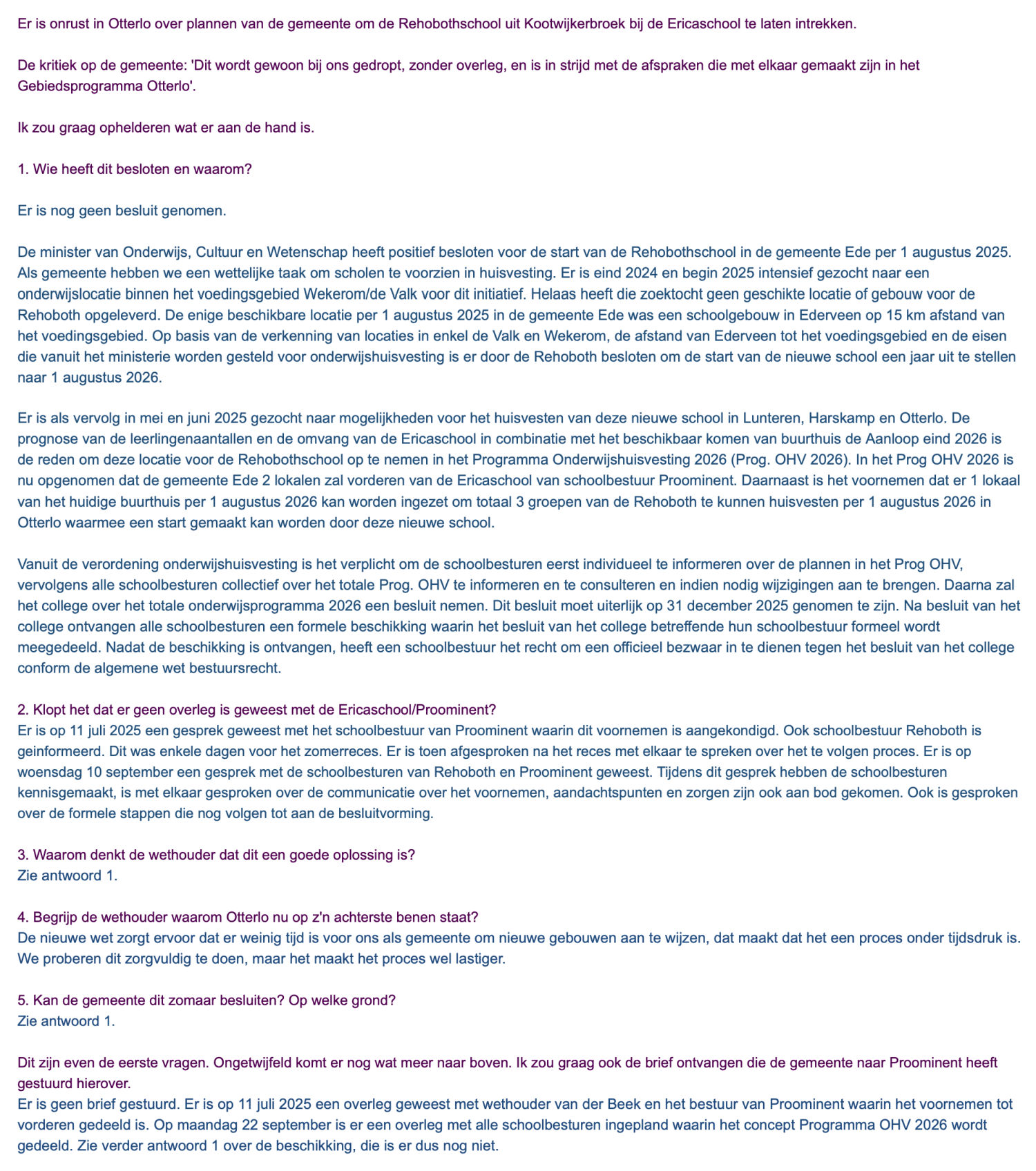 Het plan is nog niet formeel door het college vastgesteld; dat gebeurt naar verwachting in oktober. De gemeente beroept zich op haar wettelijke zorgplicht voor onderwijshuisvesting, maar de manier waarop de keuze voor Otterlo tot stand is gekomen, roept veel vragen op.